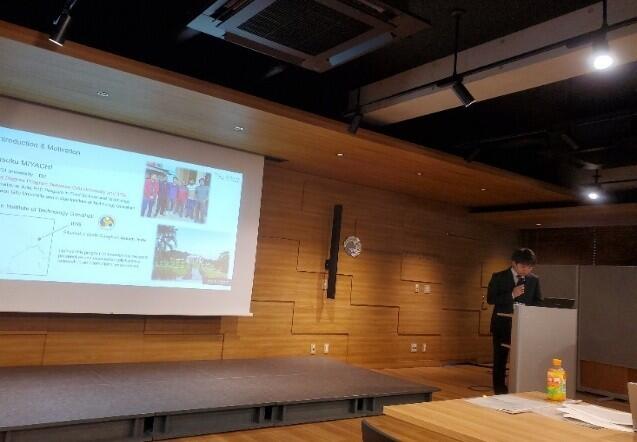 第1部では、各大学の代表学生による留学体験発表が英語で行われ、本学からはグローカルエキスパートプログラムで2023年度にインド工科大学グワハティ校(IITG)に留学した宮地さんがインドでの実体験を発表しました。