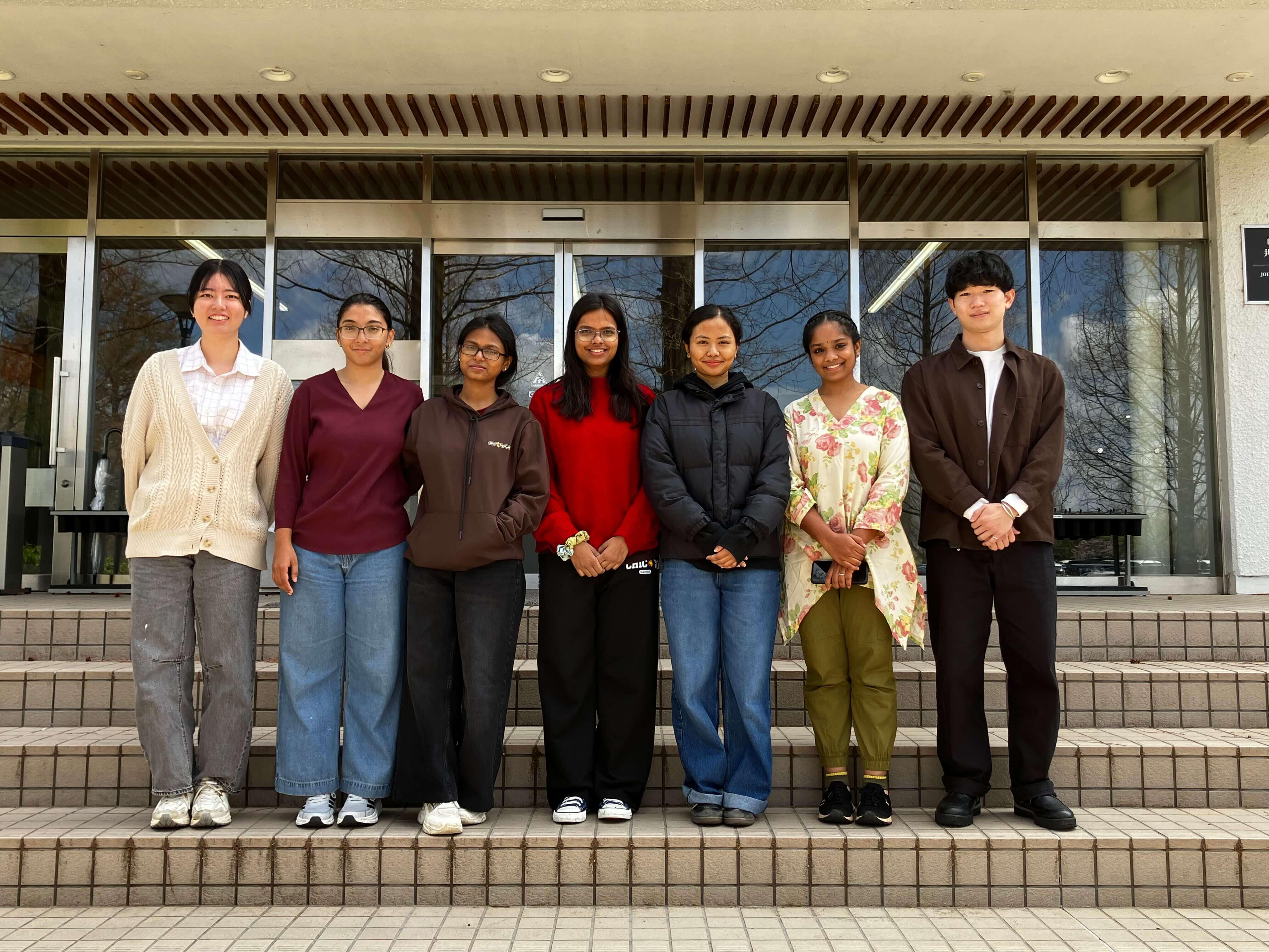本専攻M1学生の集合写真(両端2名は本学を主大学とする学生、真ん中5名がIITGを主大学とする学生)